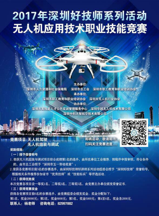 2017年深圳好技师系列活动无人机应用技术职业技能竞赛由深圳市人力资源和社会保障局、深圳市总工会、深圳市职工教育和职业培训协会主办,由深圳市职工教育和职业培训协会、深圳市无人机行业协会承办,得到了深圳市高技能人才公共实训管理服务中心、深圳华越无人机技术有限公司、深圳中科大智航空技术有限公司等单位和企业的大力支持。