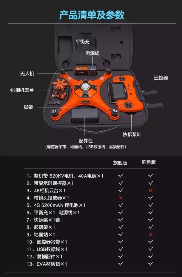 斯威普科技:成立于2011年,是全球最早研发防水类的无人机品牌,在欧美众多领域被广泛应用,尤其是在水上项目(无人机垂钓、水上救生、水下拍摄、海洋生物探索等领域),于2016年回归国内市场。