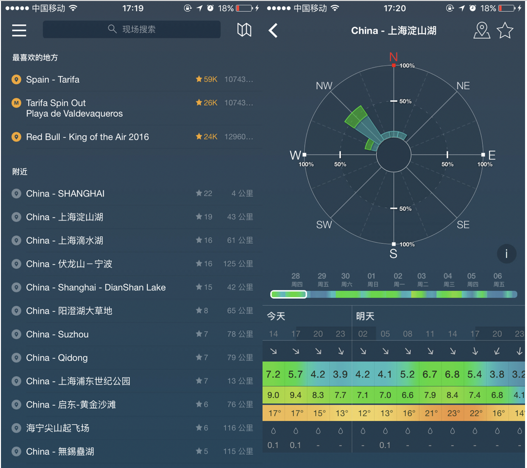 Windy还能够直接推荐附近的热门地点,并显示风速风力,打开来具体的地点的风向风速还会以动态的方式呈现,非常具有科技感。