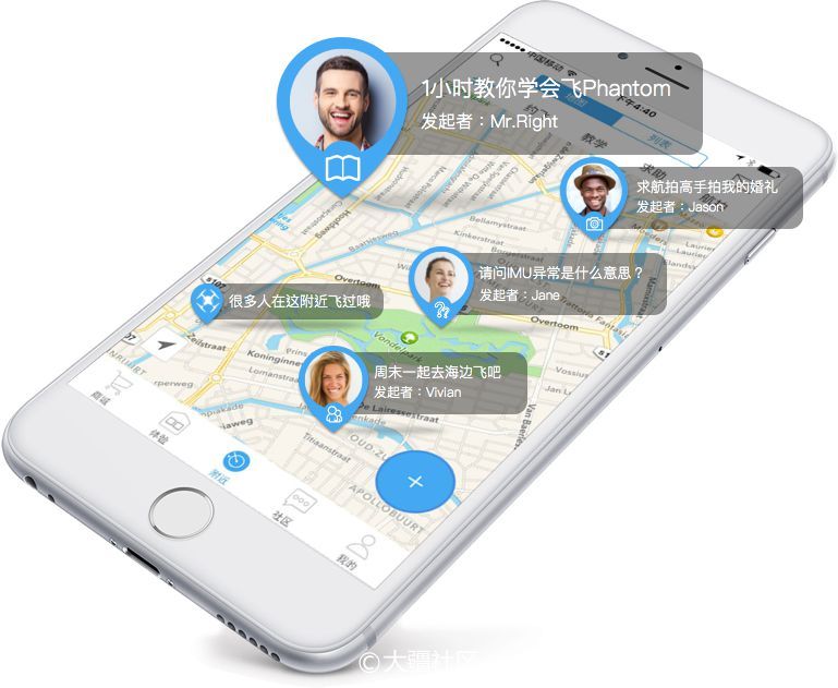 如果说入门靠Hover,那之后的修行是离不开DJI+ Discover。这款大疆的无人机应用有【附近】、【体验】和【社区】三大板块。在【附近】板块,飞友们可以查找附近的飞友,进行约飞、教学、求助等,这项功能让飞手可以迅速融入周围飞友们的圈子。