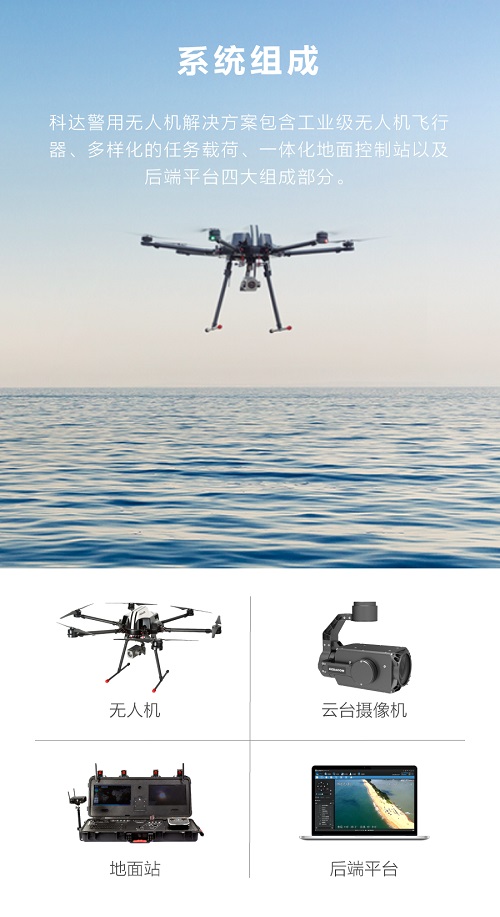科达警用无人机解决方案,具有无线图传、多任务载荷、自动避障、航迹规划等功能,可实现空中巡查、应急指挥、智能分析等应用。