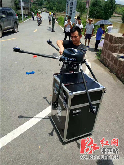 到达浦市,特警队员立即架设调试无人机装备,利用无人机负责空中搜救工作,对泸溪县浦市的汛情进行全方位监控,用无人机配备的高音喇叭进行喊话,劝居民撤离到安全区域。