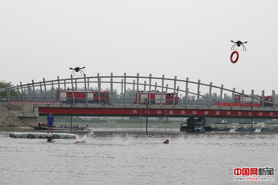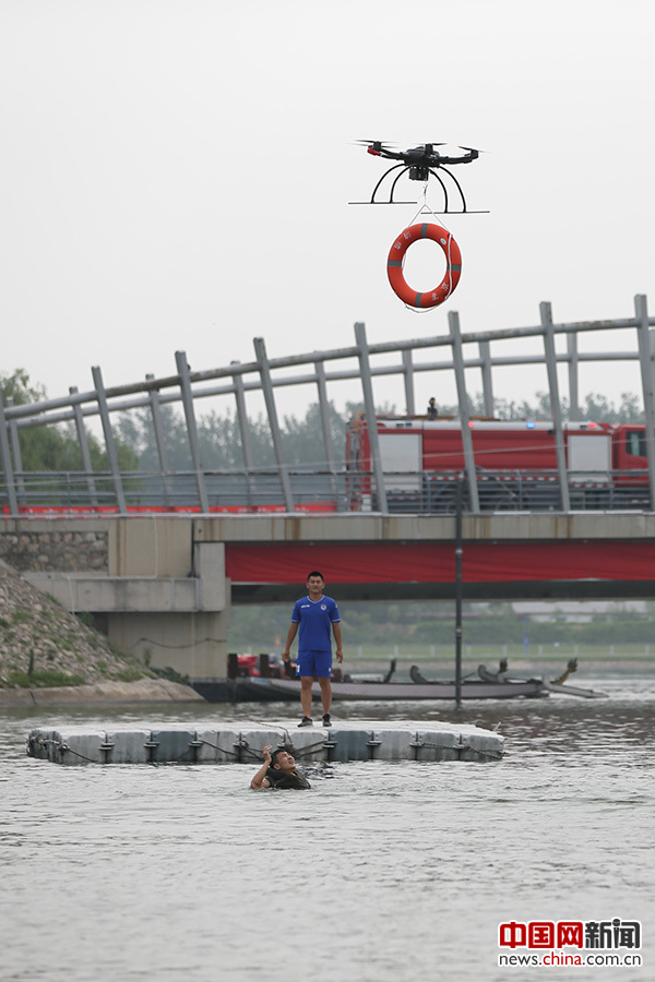 北京市2017年防汛应急救援综合实战演练3日上午在北京市奥林匹克水上公园举行。记者在演练现场看到,无人机既能运用图像传输系统监控指挥水上救援,还能在必要时空投救生圈,成为水上救援利器。