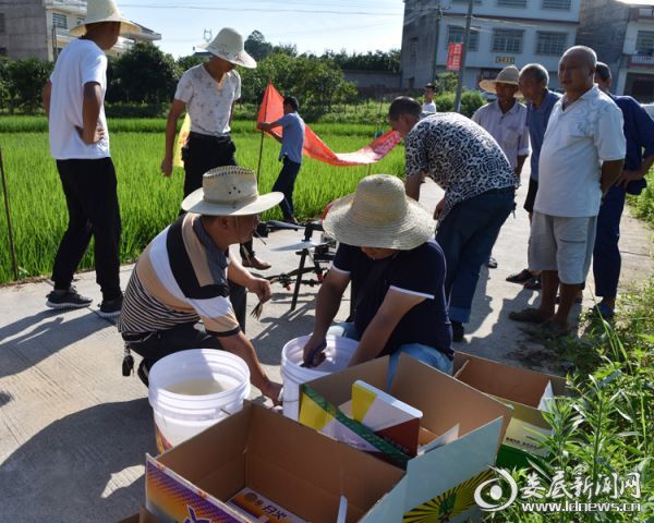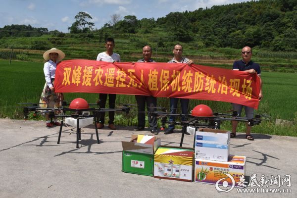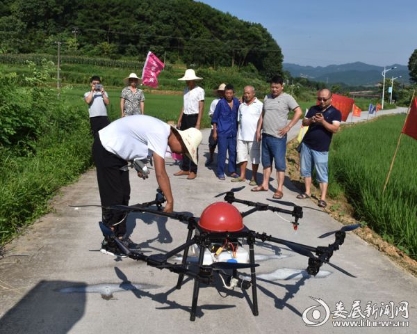 近期连续强降雨不仅使部分农田受灾,而且还十分有利于穗瘟、纹枯病等病虫害的发生蔓延。为最大限度控制好雨后水稻病虫害发生,援农机械与双峰县农家福农业技术服务部联合举办应急飞防实战演练。