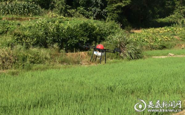 飞防现场,在农技部门的指导下,工作人员配好农药,缓缓倒入无人机自载容器。操控人员轻点飞行键,无人机缓缓升空,平移到禾苗上方时,4个喷头,向禾苗强力喷洒乳白色的农药。不到5分钟,负载10升农药,完成了低空喷洒,作业面积6亩。
