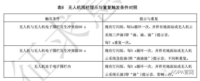 在无人机围栏使用前需对无人机和无人机云系统进行测试,逐项检查无人机和无人机云系统是否满足相应要求。测试项目如表7所示,无人机电子围栏提示与重复触发条件如表8所示: