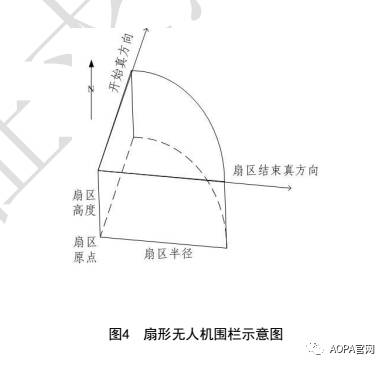4.2.4.1 扇区形无人机围栏空间几何模型是由不同海拔高度的扇区形底面和顶面组成的立方体构成,示意图见图 4 所示。一个空间的扇区面由同一平面上的扇区原点,扇区半径,扇区起止方位角(扇区开始真方向和扇区结束真方向)构成的闭合的空间区域。