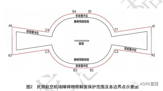 民用航空机场障碍物限制面如图2所示。民用航空机场障碍物限制面保护范围为图2中A1-A2-C2-弧C2B2-B2-B3-弧B3C3-C3-A3-A4-C4-弧C4B4-B4-B1-弧B1C1-C1-A1各点坐标、圆弧连线范围内;圆弧半径均为7 070 m。这些面的顶面高度(相对高度)均为120 m。图2中红色多边形连线范围即民用航空机场障碍物限制保护范围。