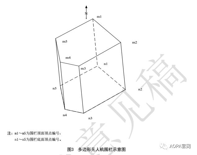 多边形无人机围栏空间几何模型由不同海拔高度的底面和顶面组成的立方体构成,示意图见图3所示。空间几何模型的一个面是由同一平面上的N个空间点构成的闭合的空间区域,空间点以真北为起点,在水平面上按顺时针依次命名。顶点顺序为顺时针方向。构成顶面和底面的顶点数量相等。