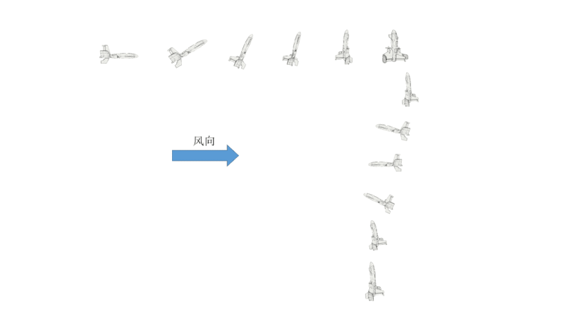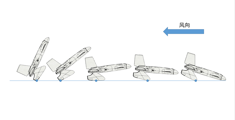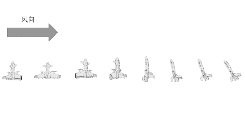 飞机在飞行过程中以垂直飞行的姿态进行悬停或起降,遭遇侧风或背风时,控制系统控制飞机机身方向转动,机腹向来风方向转动。