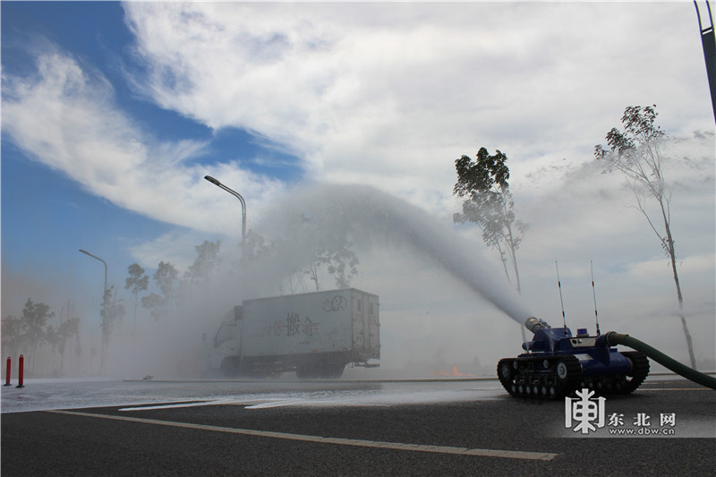 应急救援综合演练现场灭火机器人正在作业。