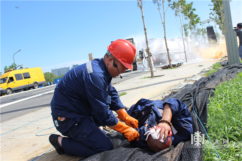 演练中,设置的模拟场景非常真实,目的是通过场景真实再现,检验各方救援力量贴近实战、有效处置的能力和水平。在演练中,出现了运输危险化学品车辆交通事故,人员受伤被困,危险品泄漏起火燃烧,江水、空气、土壤受到污染,这一系列突发情况的发生,需要各方协同、政企联动,需要专业队伍和专业装备,需要高度统一的组织指挥系统。在突发情况发生后,公安、部门、消防部门迅速封控现场、疏导交通,消防部门立即派出专业救援队伍,动用了灭火机器人、无人机等先进装备,海市部门出具救援船只,开展水污染紧急处置行动;环保部门出动车辆和船只,卫生部门出动救援车辆和医护人员,整个演练活动紧张有序,处置行动圆满完成。