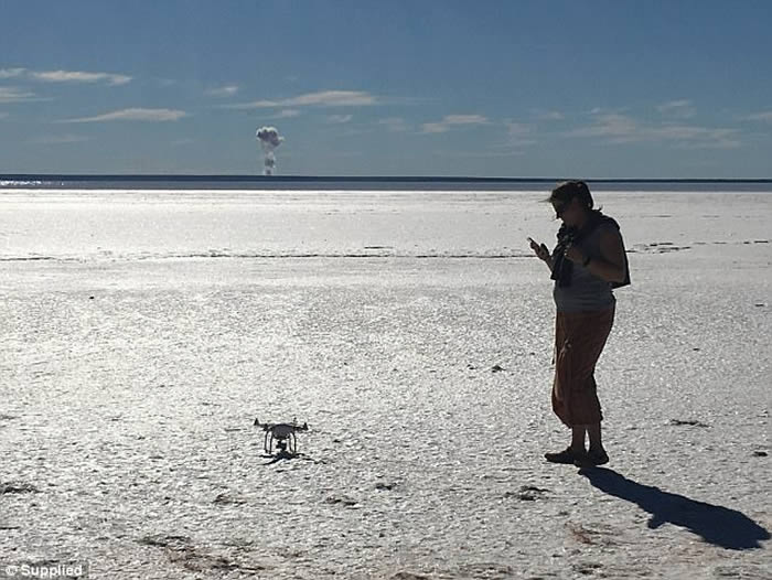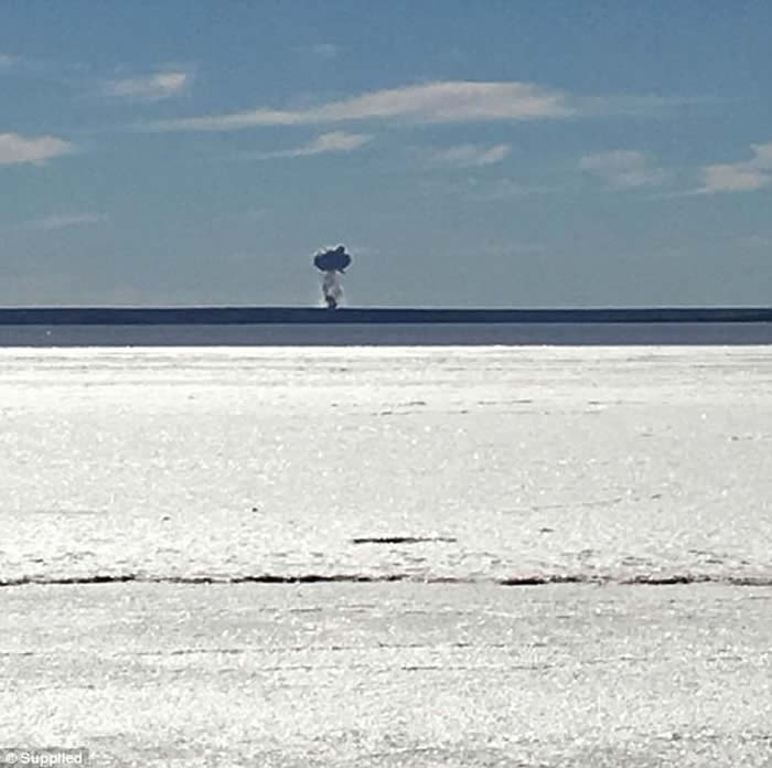 来自一个南部小镇的赖特(Jason Wright),近日与家人驶经一条公路时,下车带小孩一同观赏盐湖的风光。使用航拍机经验丰富的赖特,当时打算以航拍机拍照,但它其后于远处失控撞地。赖特相信,由于当时他们靠近伍默拉(Woomera)武器试验场地,估计航拍机是由于讯号被干扰才会失控。更令他惊奇的是,约一分钟后,远处突然出现火光,火球更形成蘑菇云,估计约有30层楼高。他表示﹕“实在是令人深刻,火球非常光亮,并能感受到当中的热力。”
