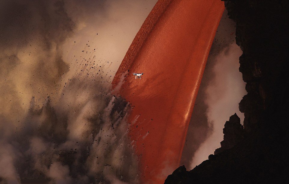 无人机的镜头瞬间被烟雾遮蔽,操控屏幕上一片漆黑,就在摄影师苦恼的时候,一块飞起的碎石击中了无人机,无人机就这样掉进火山口被融化了,真的可怕。