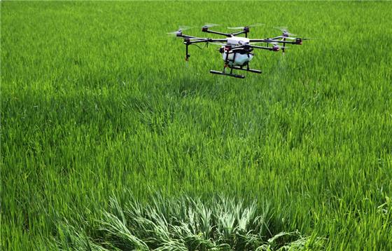 植保无人机洒“药雨”防治水稻病虫害。