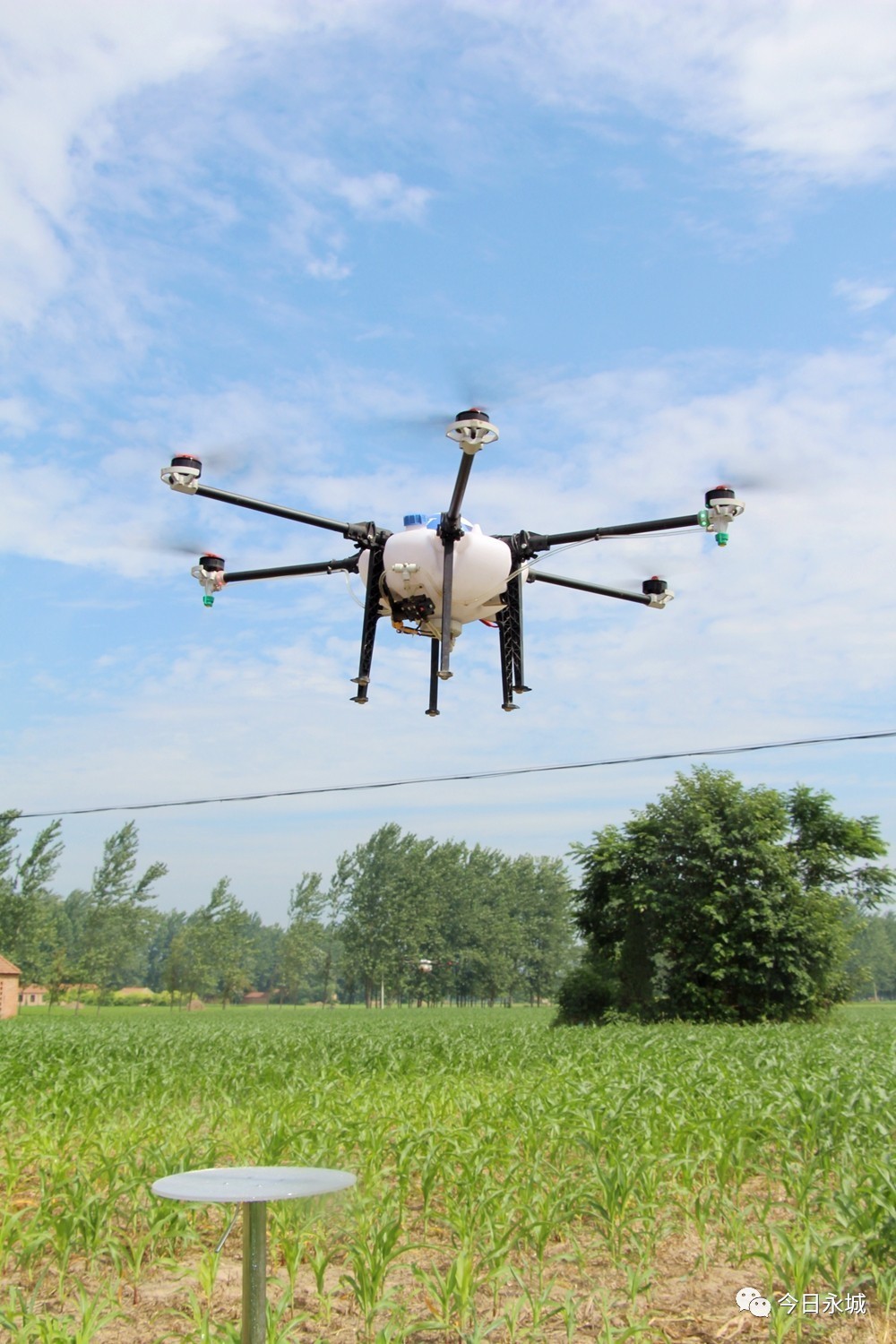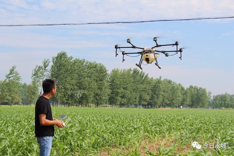 只见操作人员的手指在平板电脑上轻轻一点,大疆MG—1S植保无人机立刻升空,瞬间就朝玉米田内飞出百米,同时喷下细细的雾气,将农药均匀喷洒在玉米叶面上。