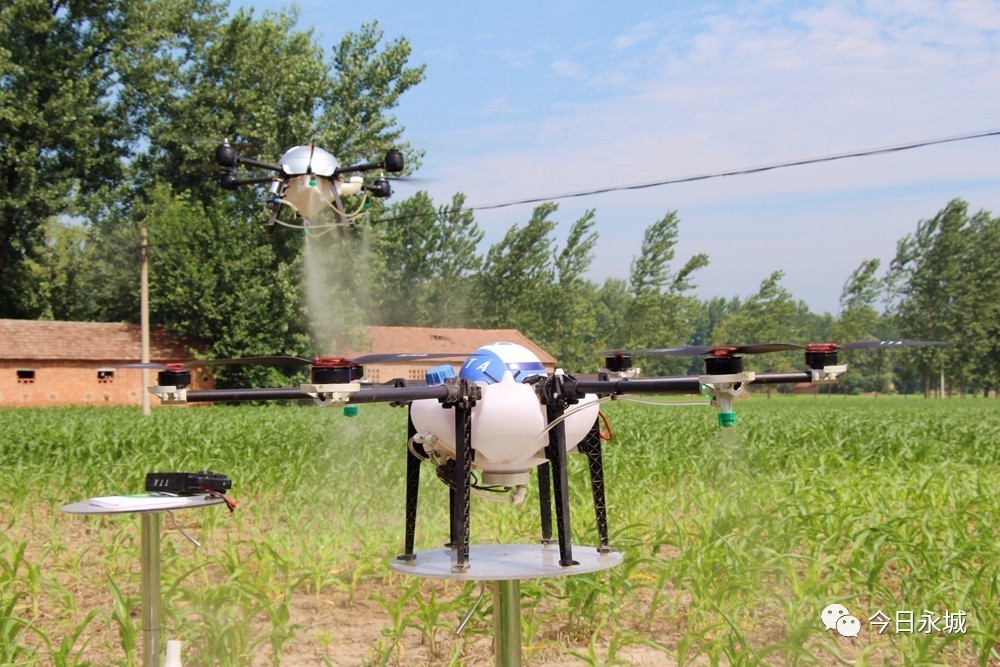 7月13日,在永城市高庄镇盛源农机专业合作社的玉米田内举行的新型农业机械现场观摩会上,种类多样的新型无人植保机械集体亮相,让众多前来参观的各地农机专家惊叹不已。