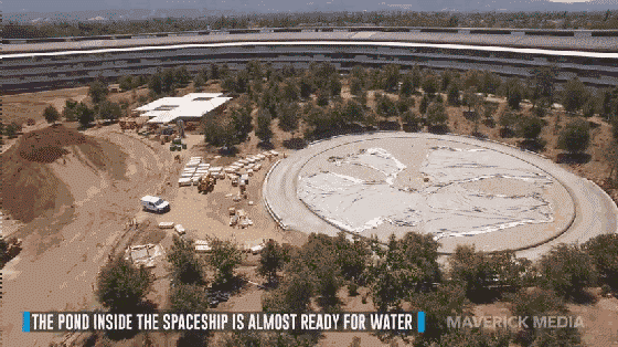 这段最新的视频,首先展示了乔布斯剧场的一瞥,我们看到整个中央部位正在进行,同时人造池塘也已经开始注水。另外,在游客中心部位的施工进展很明显,我们看到了一个类似于芝加哥苹果商店的屋顶设计。