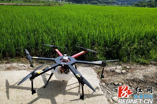 7月19日,武陵源区协合乡李家岗村。地面上,数百亩优质稻绿浪滚滚。天空中,2架无人机同时喷洒农药。场面十分壮观,吸引不少农户前来观摩。田野上的无人机,成为武陵源区农业走向现代化的一个标志。