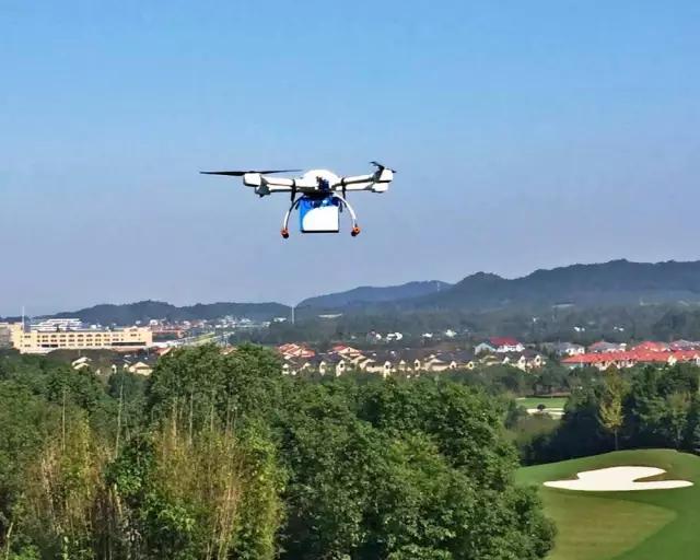 安吉四季如春的高尔夫球场上,土豪们帅气挥杆,三架白色旋翼无人机则在50米空中俯瞰绿色草坪。每架无人机下吊着一个蓝色盒子,平缓地向人群飞去……