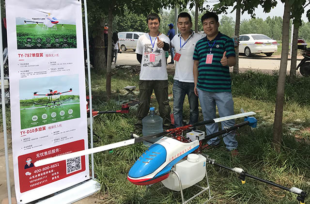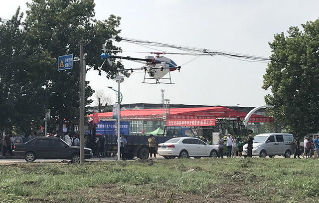 公司推广的大载荷燃 油动力无人飞机田鹰-999载重量达35公斤,续航时间长,可实现完全程控飞行。该机型作业效率高,采用先进的差分GPS系统,作业定位更准确,避免多 喷、漏喷等缺陷出现,自主飞行能够在设定区域内自动飞行喷药,喷药量随飞行速度变化而调整,保证每平方米喷药量一致,智能的航线规划功能省去人工飞行的劳 累。同时具有故障自检测功能,维护操作简单易学。