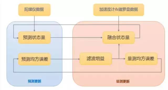 以计算飞机姿态角的融合方法为例,EKF更新过程主要分为两个部分,预测更新和量测更新。预测更新主要利用陀螺仪更新预测状态量,同时计算该状态量的协方差矩阵。在量测更新中先会计算滤波增益,然后使用滤波增益融合预测状态量、加速度计以及磁罗盘的数据,成为一个融合状态量,同时计算融合状态量的协方差矩阵,在下一次更新周期的计算中使用。