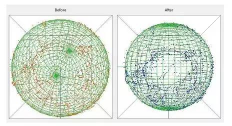 以磁罗盘的粗校准为例,由于地球上任意位置的地磁场强度在较长时间跨度内都可视为是恒定的,当转动磁罗盘时,根据相对运动可假设磁罗盘固定不动,而地磁场矢量随之在转动,其矢量端点在空间的轨迹应为一个标准的球体,但由于传感器存在误差,实际测出的数据并不严格都在球体的表面,这时候就需要根据测量出来的数值以及已知的准确值来计算两者之间的换算关系,也就是该款磁罗盘的误差模型。在以后使用该款磁罗盘时就可以根据粗校准得出的误差模型来处理测量值,使得测量值的误差减小。