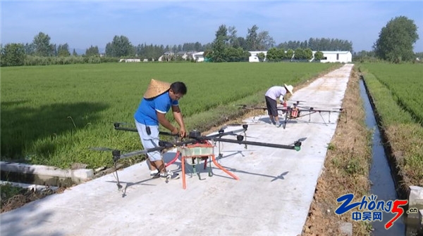 早上8点刚过,金坛区朱林镇黄金村农机合作社工作人员,正在调试这台用于喷洒农药的大型无人机。装上电池,只需一人操控,无人机就稳稳地升空了。