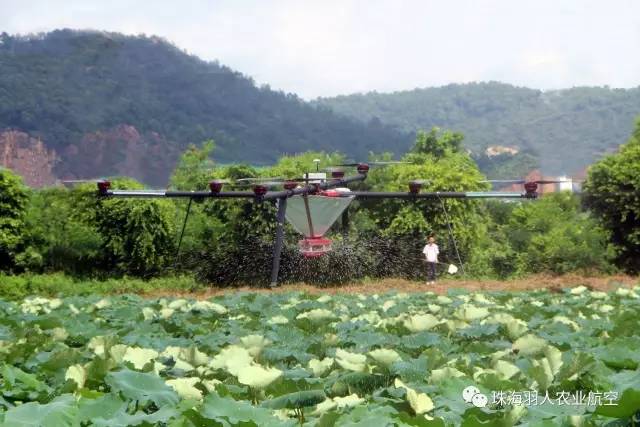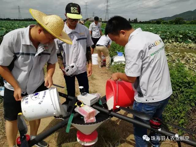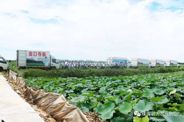 作业现场,播撒无人机在飞控手娴熟的操控下,为出色完成此次户外施肥作业植保工作,在气温高达30摄氏度的烈日下,珠海羽人虫口夺粮飞防服务队一直顶着热辣的太阳,坚守在农田最前沿。仅仅两个小时不到,施肥作业近达百亩莲藕地,综合效率远远比人工高达百倍。