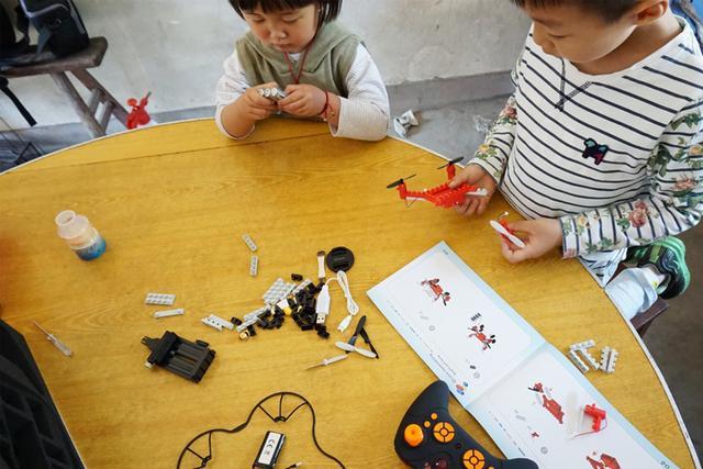 积木的魅力总是那么大,三岁的妹妹也来凑热闹,说要帮忙。哥哥说,那你把电池的包装拆了,那个简单点,你可以做的到。两兄妹配合默契,也并未如以往那种看到一个喜爱的玩具,互相争抢的事发生。