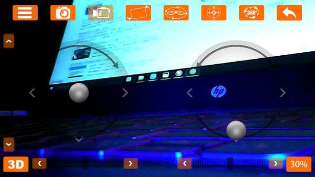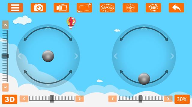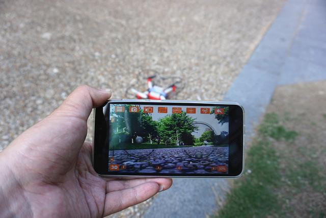 遥控器界面,点击“开始”进入到app控制界面,能看到界面上两个浮动的点,右边往上推即可以起飞,然后左右调控方向。在顶上一排控制键,可以看到拍照,摄像,手机重力遥控,盘旋,定点降落等,控制内容完全不比目前市面上的很多无人机来的少。而且手机接通无人机后摄像头即可以连上,可以体验一番“上帝视角看世界”。
