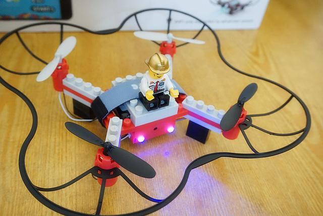 虽然是一台玩具无人机,不过该有的一个也不少。积木搭建的骨架,机翼,保护架,指示灯甚至还有摄像头。和正式的无人机一样,不仅能起飞降落,做各种动作,还能拍照拍视频,麻雀虽小五脏俱全。
