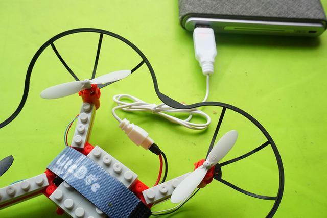 其实对于遥控器的掌控刚开始是需要学习一段时间,因为灵敏度还是比较大。所以首次试飞时就是各种撞击,但完全不用玩普通无人机时炸机的危险,经历过各种撞墙,衰地,撞树,尽然毫发无损。不过两个积木搭的支撑脚确实容易掉,所以每次飞的时候直接卸了,并不会影响飞行。因为机身携带锂电池仅600mAh,所以每次飞行的时间都在十分钟以内,但对于孩子来说已经足够。