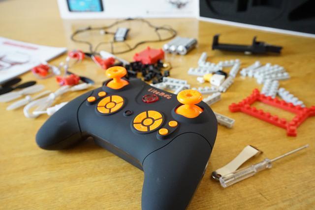打开包装,第一映入眼帘的是一本说明书,里面是一些积木的散件和一个专业的无人机遥控器。