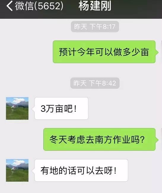我带着十分美丽的心情开始了与老杨的沟通,习惯性的给老杨设定了几个问题。老杨经营的是昌吉奇台的汉和7S店,具有飞机销售的权利,他说销售给陈总的一架飞机,已经打药作业1.2万了,自己的两架飞机也作业了1.7万亩。由于北疆的种植主要以食葵、葫芦瓜、玉米、打瓜、小麦为主,过去的30天,这些作物老杨都打过,在当地种植作物的防效上摸索了许多解决方案。当我问他有没有回头客找他作业时,我内心是想验证下,老杨到底是不是负责任的人,如果不负责任,我想回头客应该不会太多。我得到了老杨的肯定回答,回头客不少,同时,老客户介绍新客户也很多。