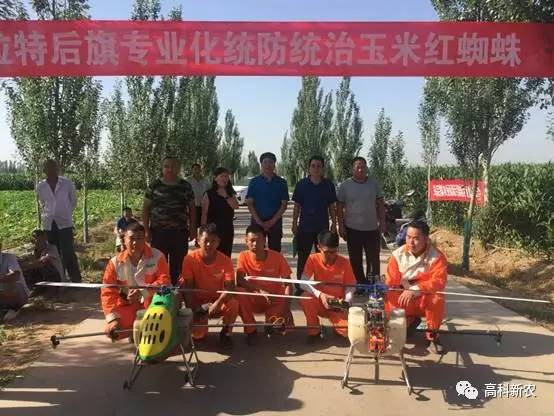 红蜘蛛一般盛发期在5月,7-8月为全年发生的高峰期。此虫喜欢高温干燥环境,在高温干旱的气候条件下,繁殖迅速,以口器刺入叶片内吮吸汁液,使叶绿素受到破坏,叶片呈现灰黄点或斑块,叶片桔黄、脱落,甚至造成植株死亡,为害严重。为了防治红蜘蛛爆发,6月中旬至今,经乌拉特后旗农机局、植保站推广中心主导,泊亿及高科新农的5名飞手完成了4000亩玉米地的红蜘蛛统防统治。