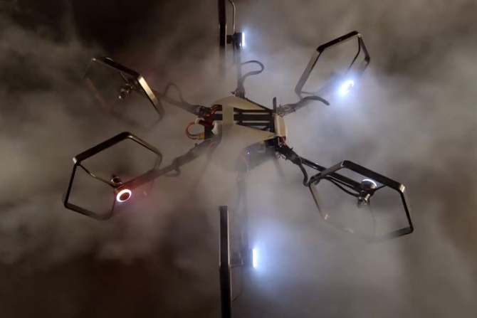 与其他的无人机不同的是,Voliro的螺旋桨可以弯曲,并且指向任何方向。这样一来,Voliro就可以在天空以任意的姿态飞行。因为螺旋桨的角度决定无人机的飞行方式,而这种六翼设计,可以使无人机垂直起飞,在试验中,无人机可以像关在玻璃球里的仓鼠一样滚动飞行。
