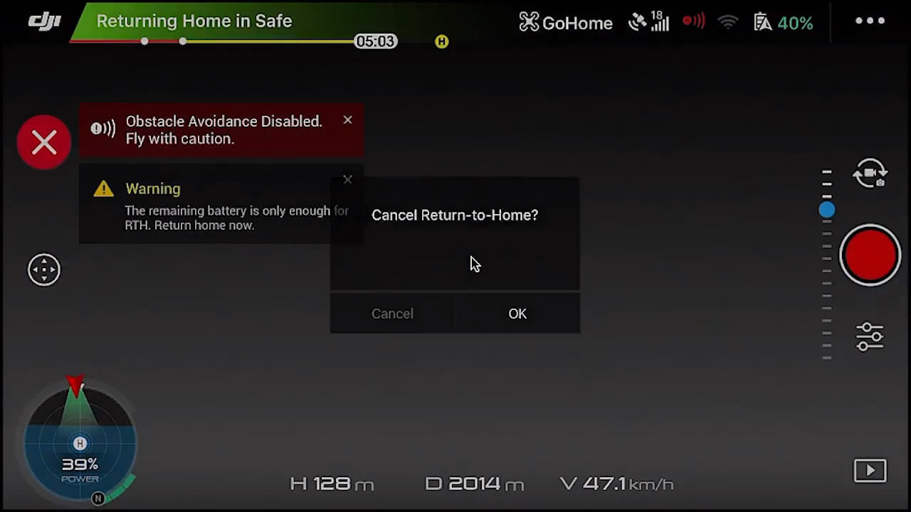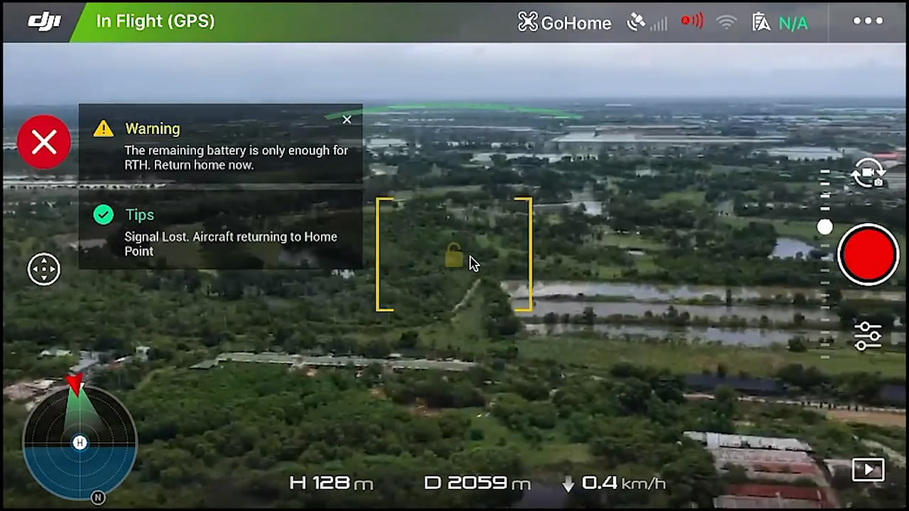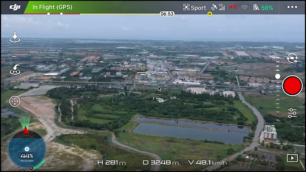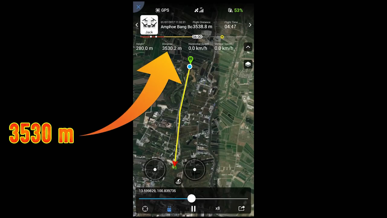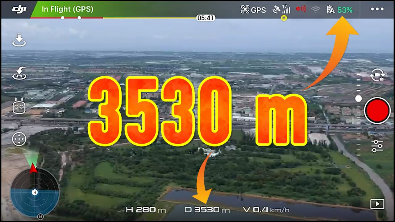 电量到53%必须要返航了,此时距离达到3530m,此时图传是有些卡顿,但仍然还可以工作。