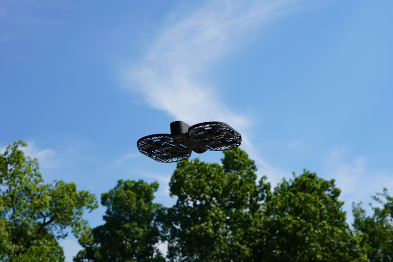 这款无人机最大的特点就是对起飞场地要求极低,室内狭小空间也能飞的起来,而且不伤人,一键起飞、一键降落、自动跟随、延时摄影这些功能一个都不少,而且续航能力可达到15分钟。
