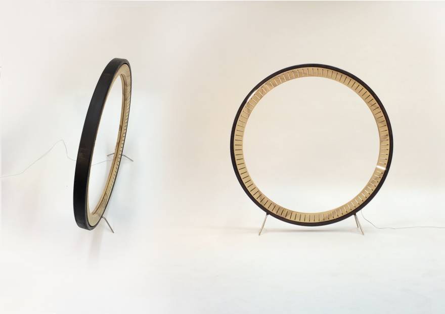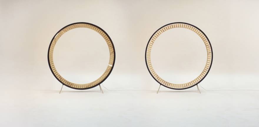 带有时钟功能的一款灯具,由直径为45英寸的两个木环组成。在两个环之间安装有LED灯带,在时钟模式下,环只是部分照明,是小时和分钟的指针;而随着环境光模式打开,整个环都将被照亮。