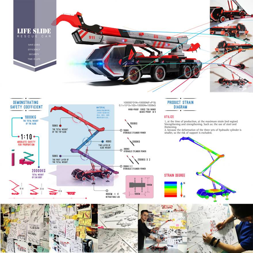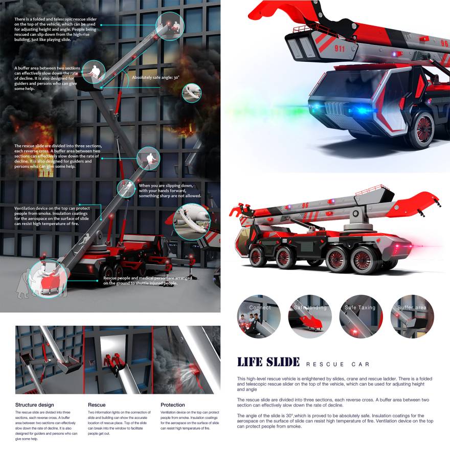 这款消防救援车由滑梯、吊车和救援梯所组成。在车辆顶部有一个折叠伸缩的救援滑块,可以用来调整高度和角度。被救出的人可以从高楼上滑下来,就像玩滑梯一样。两段之间的缓冲区可以有效地减缓下降的速度。