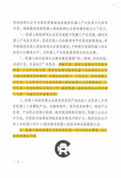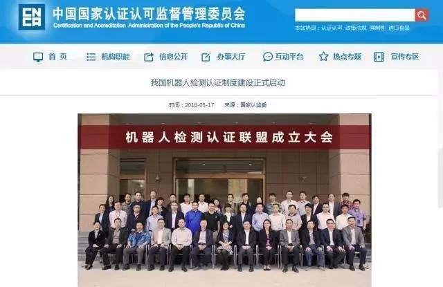 2016年12月27日,国家质量监督检验检疫总局、国家发展和改革委员会、工业和信息化部、国家认证认可监督管理委员会、 国家标准化管理委员会联合发布关于推进机器人检测认证体系建设的意见。
