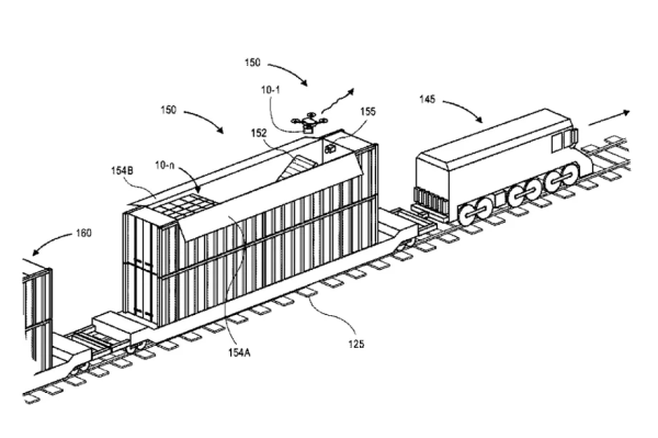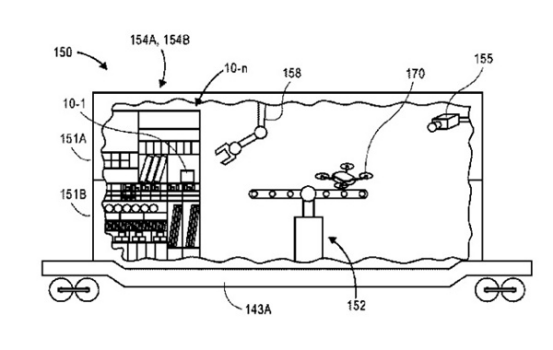 该专利还讨论了这些移动集装箱作为“转发库存物品”的潜在手段的可能性。第二辆汽车或集装箱可以携带“可以合理预期对库存物品需求”的物品,这将实现公司缩短交货时间。在这种情况下,可以放置从最近的配发中心发送的物品的订单,无论是物理仓库还是恰好位于附近铁路线上的仓库。该订单将被加载到无人机上,然后起飞,发送包裹并返回,在那里它可以再次充电。