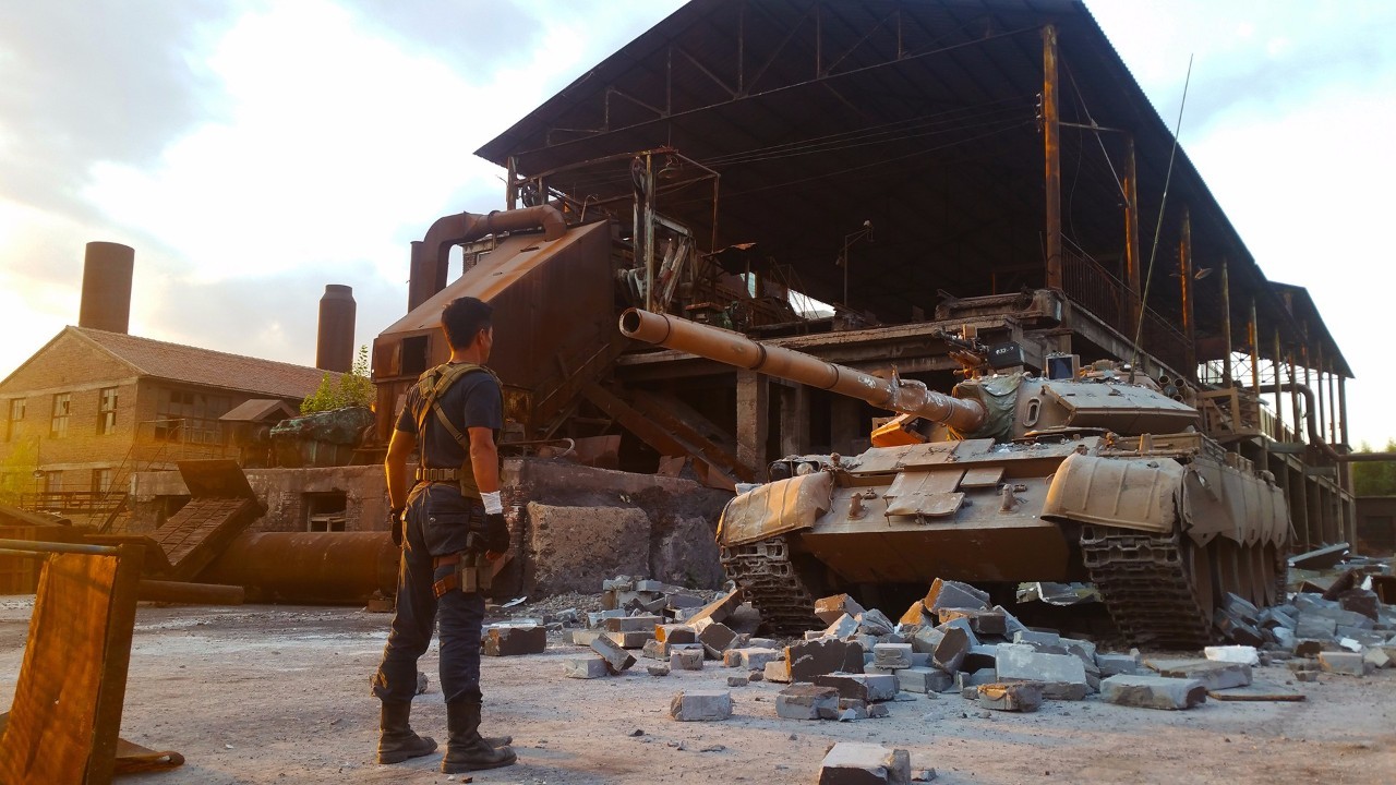 此次的《战狼2》拍摄中,有不少近景也是使用无人机拍摄。在影片后半段,反派雇佣军打开仓库门,无人机从老爹上半身旁边飞过,逐渐拉远呈现出现场的紧急状态。