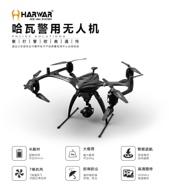哈瓦工作人员接受记者采访表示:哈瓦无人机续航时间长达60分钟,载重可达8kg, 往返飞行距离可达20KM;飞行高度可达海拔5000米,可抗7级大风,防尘、防中雨,抗电磁干扰,可在高低温环境(-40℃至85℃)、高海拔环境、复杂气流环境等严苛环境下稳定飞行。已通过国际级研究机构专业测试。