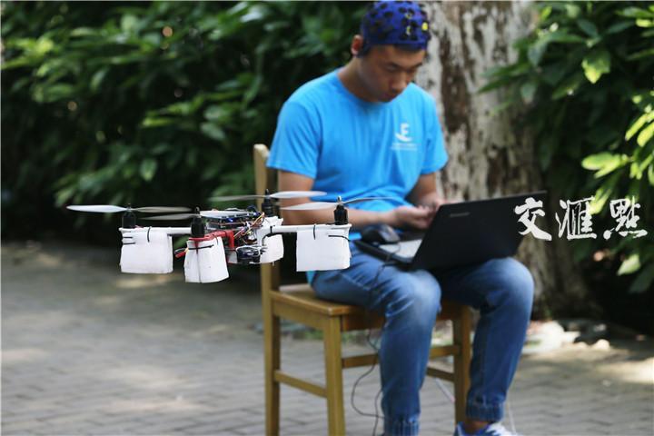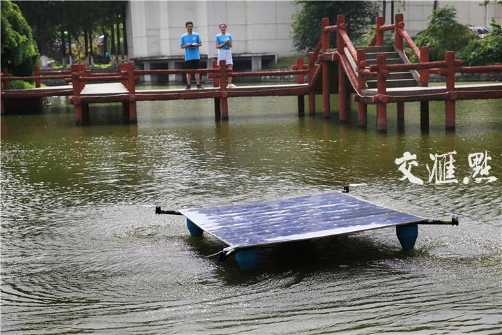 除了意念控制飞机,现场还有另外一项“黑科技”让大家穿越到未来世界。一架叫“海陆游弋者”的蓝色无人机漂浮在校园的湖面上,开机起飞后,霸气地盘旋直上。原来,这架无人机不但能在天上飞,还是完全防水,可以在水中“飞行”。