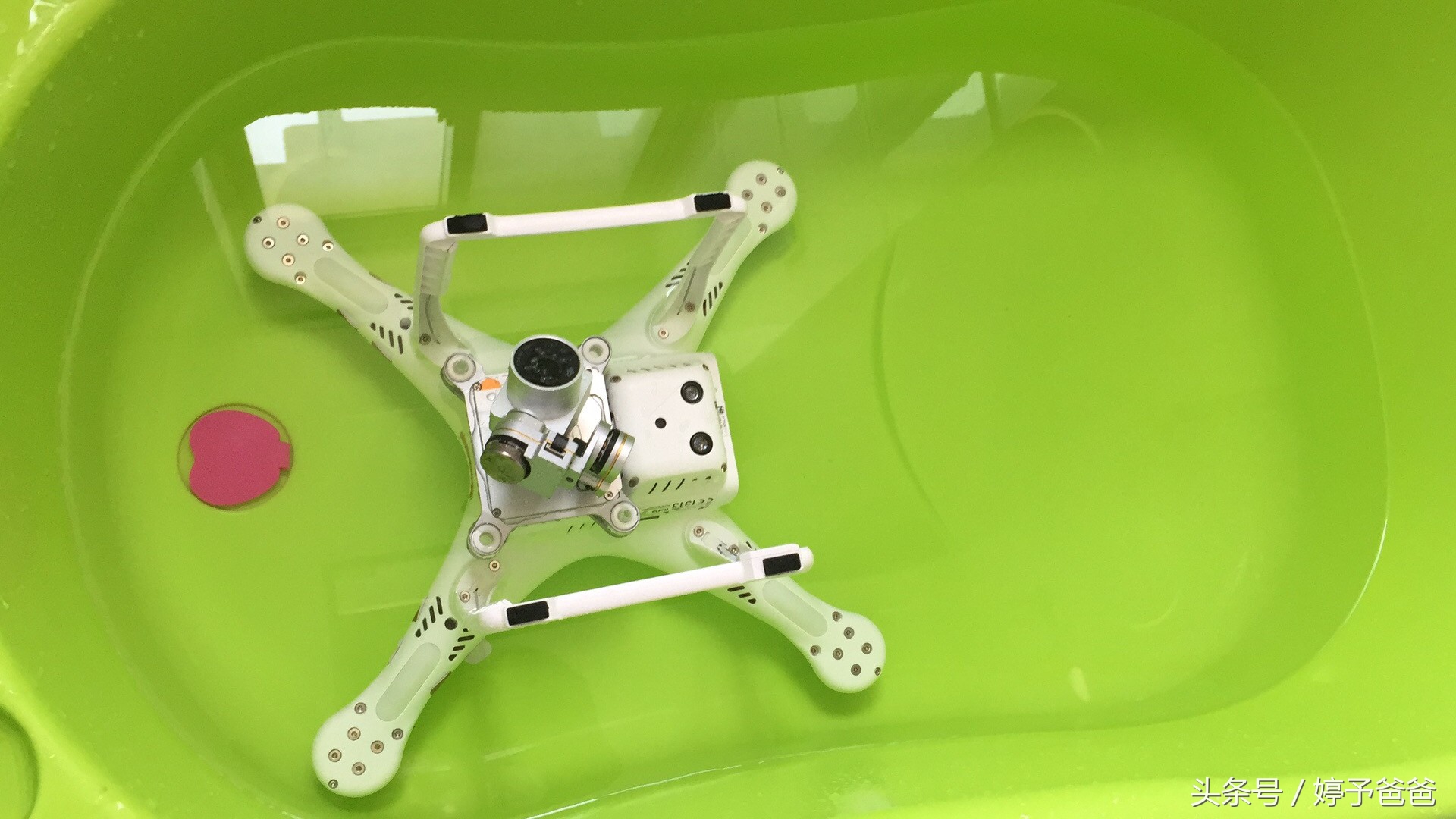 回到家,鞋都没换,直接对着自来水大量冲洗,感觉差不多了就在盆子里放满水,把无人机放进去泡,海水的腐蚀性太强,要充分稀释机器内的盐分。