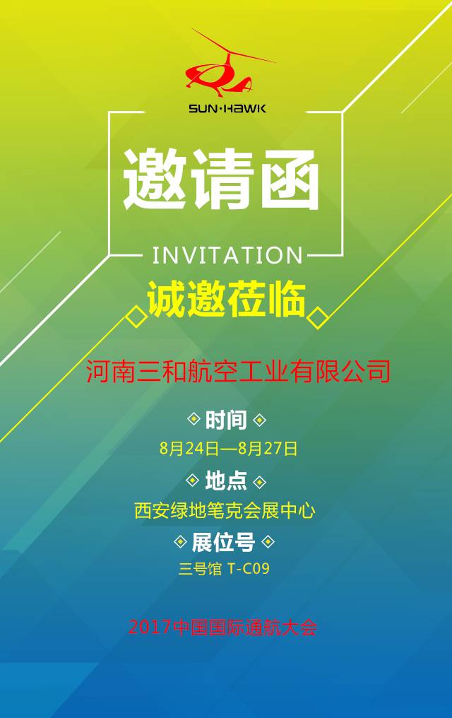 8月24日-27日,2017中国国际通用航空大会将在陕西西安绿地笔克会展中心举行。本届大会由陕西省政府、中国贸促会、中国民航局、中航工业集团4家单位联合主办,以“推动通用航空发展,加快航空产业聚集”为主题。届时河南三和航空工业有限公司将携带自主研发生产的“太阳之鹰”自转旋翼机、“穿云鹰”无人旋翼机、“祥云320”载人无人机、“天眼”垂直起降复合翼无人机、“小百灵”垂直起降无人机亮相,我们将在三号馆T-C09展位,期待您的莅临参观!