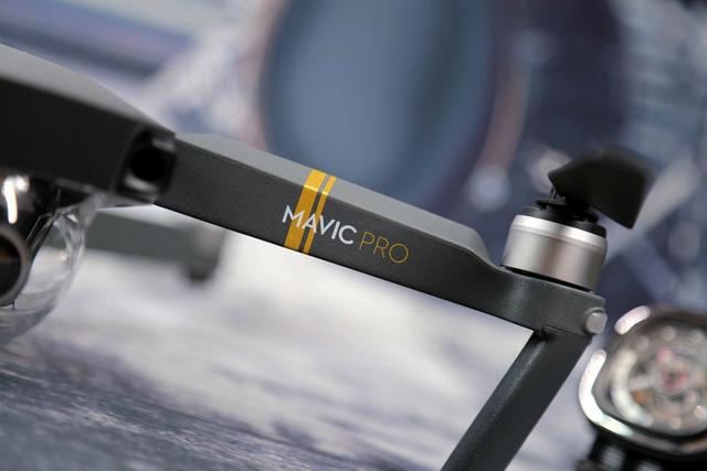 无人机折叠起来大小与一瓶中瓶冰红茶差不多大小,便携性相比之前使用过的无人机都要好。机臂上一粗一细的两条金色装饰上印着MAVIC PRO的标志。