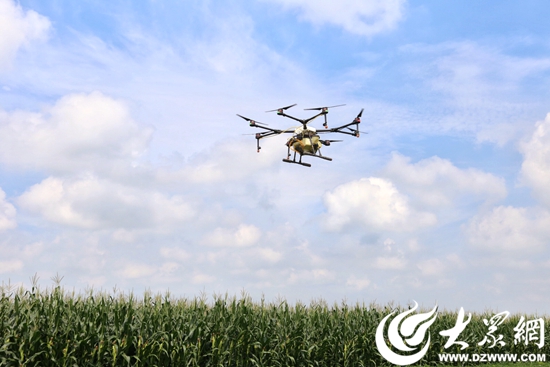 植保无人机盘旋在玉米地上空。